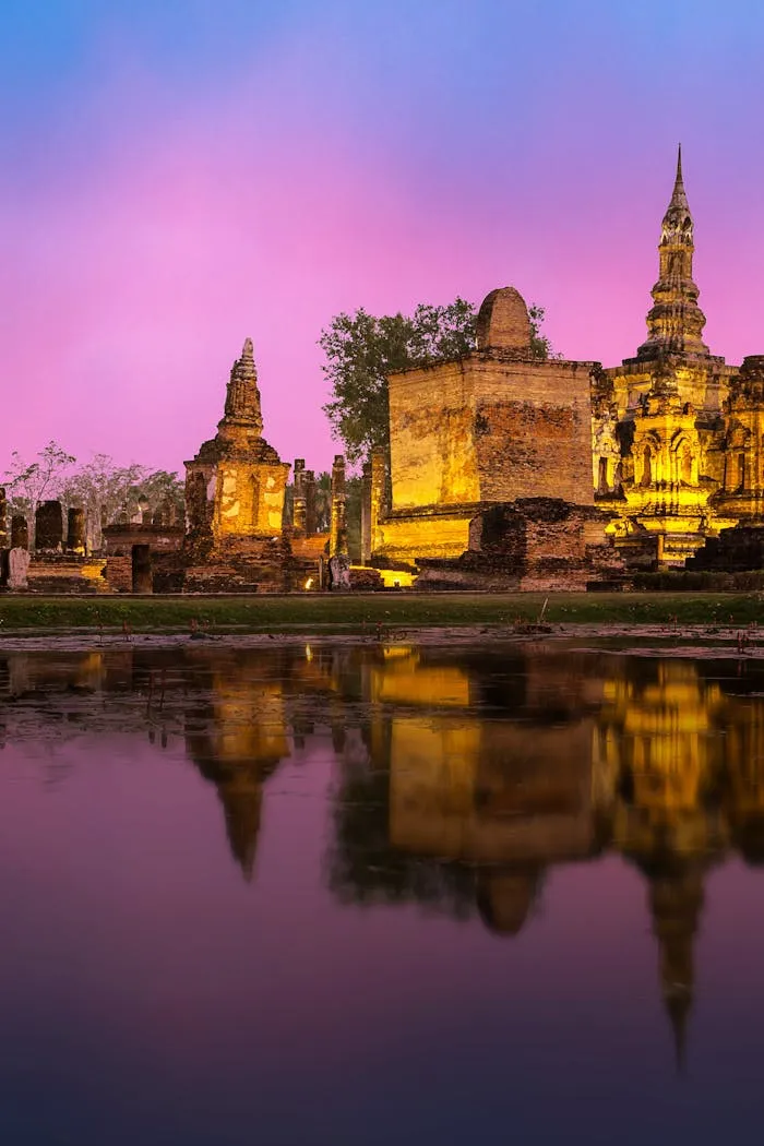 Salida terrestre hacia Sukhothai. Visita al Parque Histórico (UNESCO) con templos y estatuas monumentales del periodo Sukhothai.